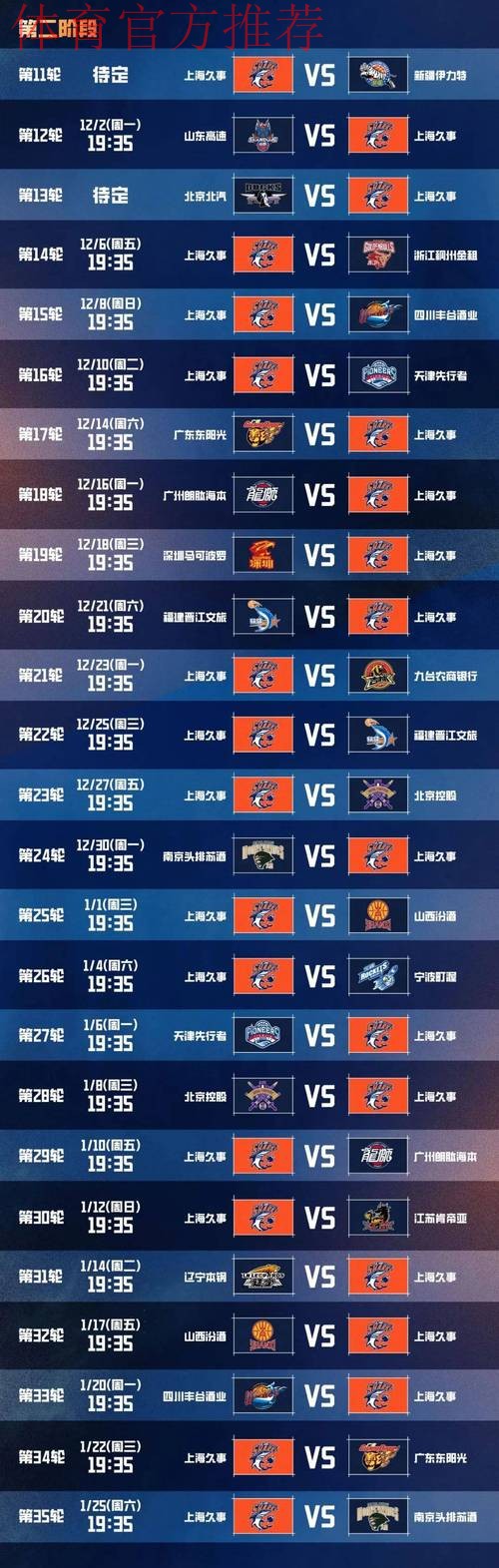 上海男篮分享常规赛赛程表:今晚将迎潜力赛首战